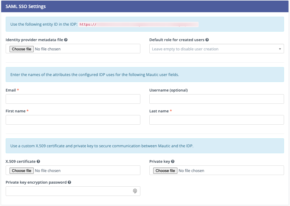 Custom attributes - Mautic requires three custom attributes in the IDP responses for the User Email, first name and last name. Username is also supported but is optional. Configure the attribute names used by the IDP in Mautic’s Configuration > User/Authentication Settings under the ‘Enter the names of the attributes the configured IDP uses for the following Mautic User fields’ section.