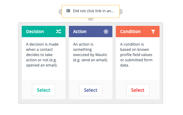 Here are the decisions that Mautic offers in the Campaign Builder: