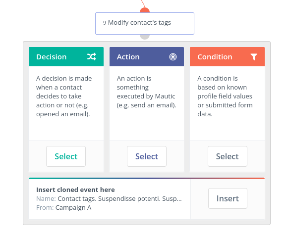 Since Mautic 5.1, the Campaign builder includes a feature that allows Users to clone - copy and paste - Campaign events, making it easier to replicate complex workflows or reuse specific actions, decisions, or conditions across different Campaigns. This feature supports cloning events within the same Campaign as well as between different Campaigns.