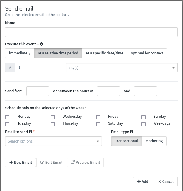 Sends a transaction or marketing Email to the selected Contact. You can send a transactional Email to the Contact multiple times. You can only send a marketing Email to the Contact once across multiple sources. If the Contact has already received this Email from another source or the current Campaign, they aren’t sent the Email again and the Contact progresses through the Campaign. |