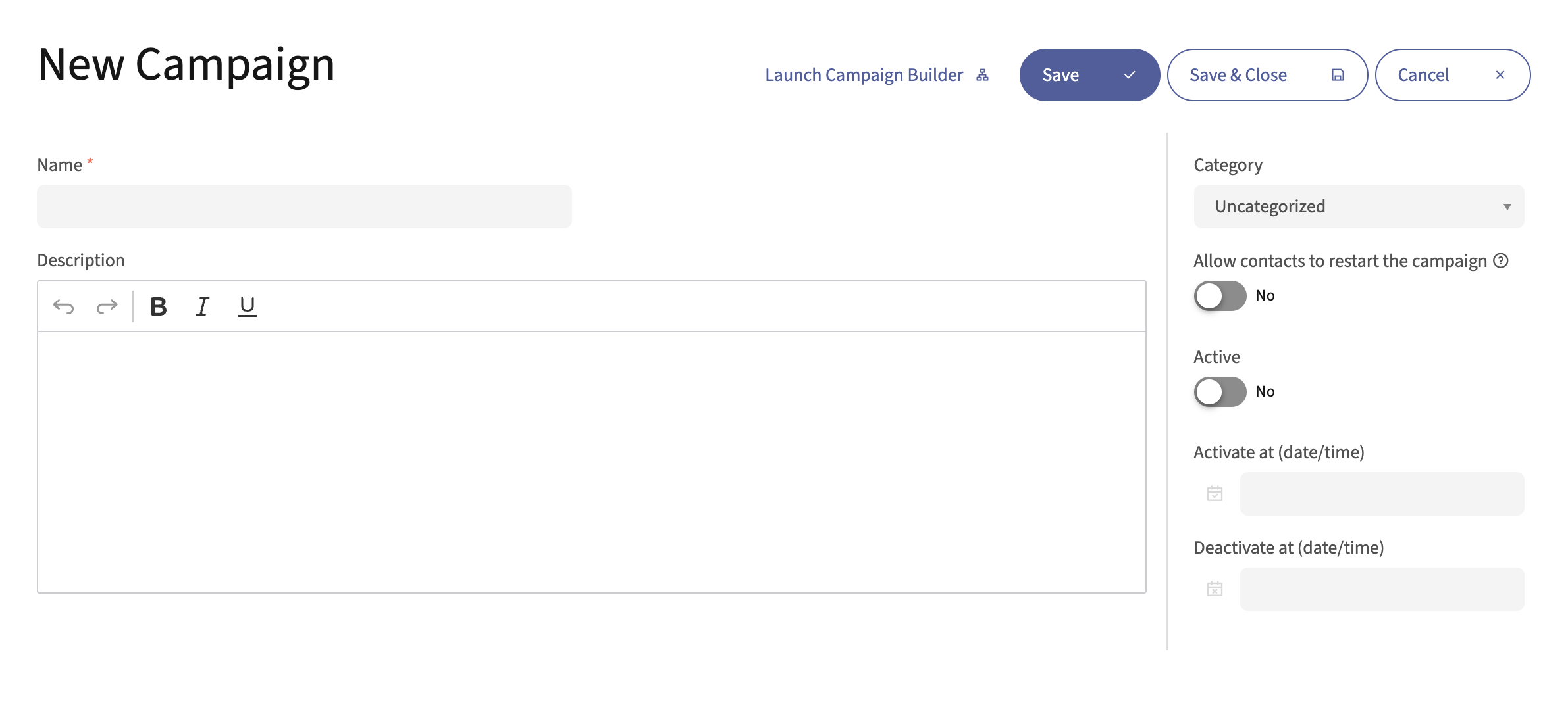 Creating Campaigns is a central part of the marketing automation process. When you create a new Campaign, you perform the basic administrative tasks such as choosing a name for the Campaign, creating a description, assigning a Category and defining activating information for the Campaign.