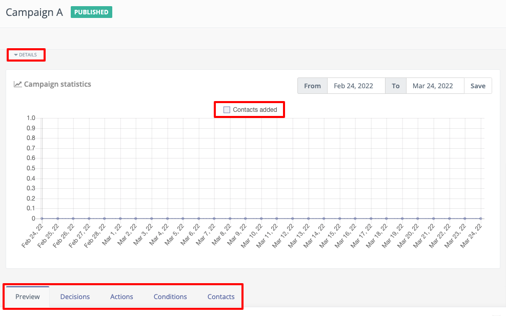 Click any Campaign name on the Campaigns list to take you to the Campaign overview. Each tab displays details of your Campaign, including the number of Contacts added to the Campaign, the number of Emails sent, the number of page views resulting from the Campaign, and more.