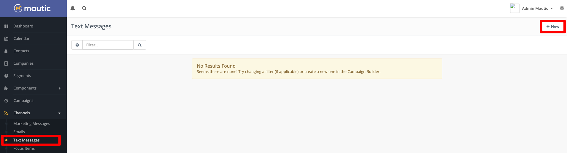To create a Text Message, navigate to Channels > Text Messages and click the ‘New’ button.