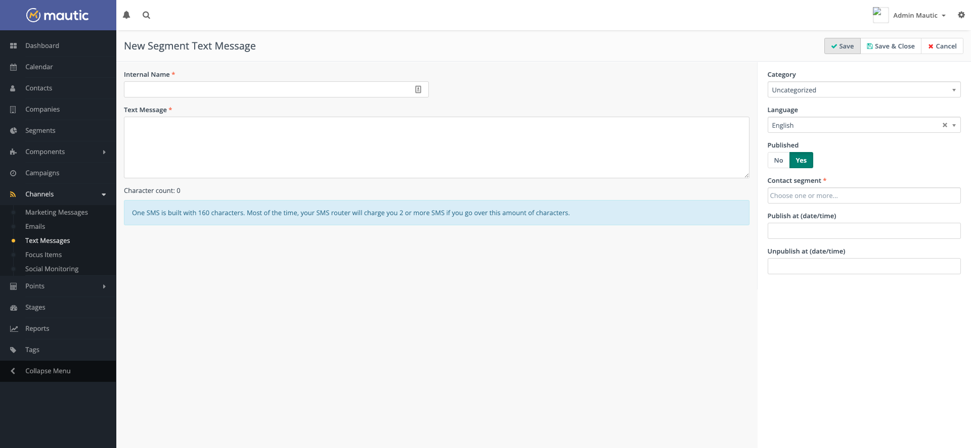 Internal name - This is the internal name used within Mautic when referring to this Text Message. For example, Mautic uses this in dropdown selection lists in the Campaign Builder.