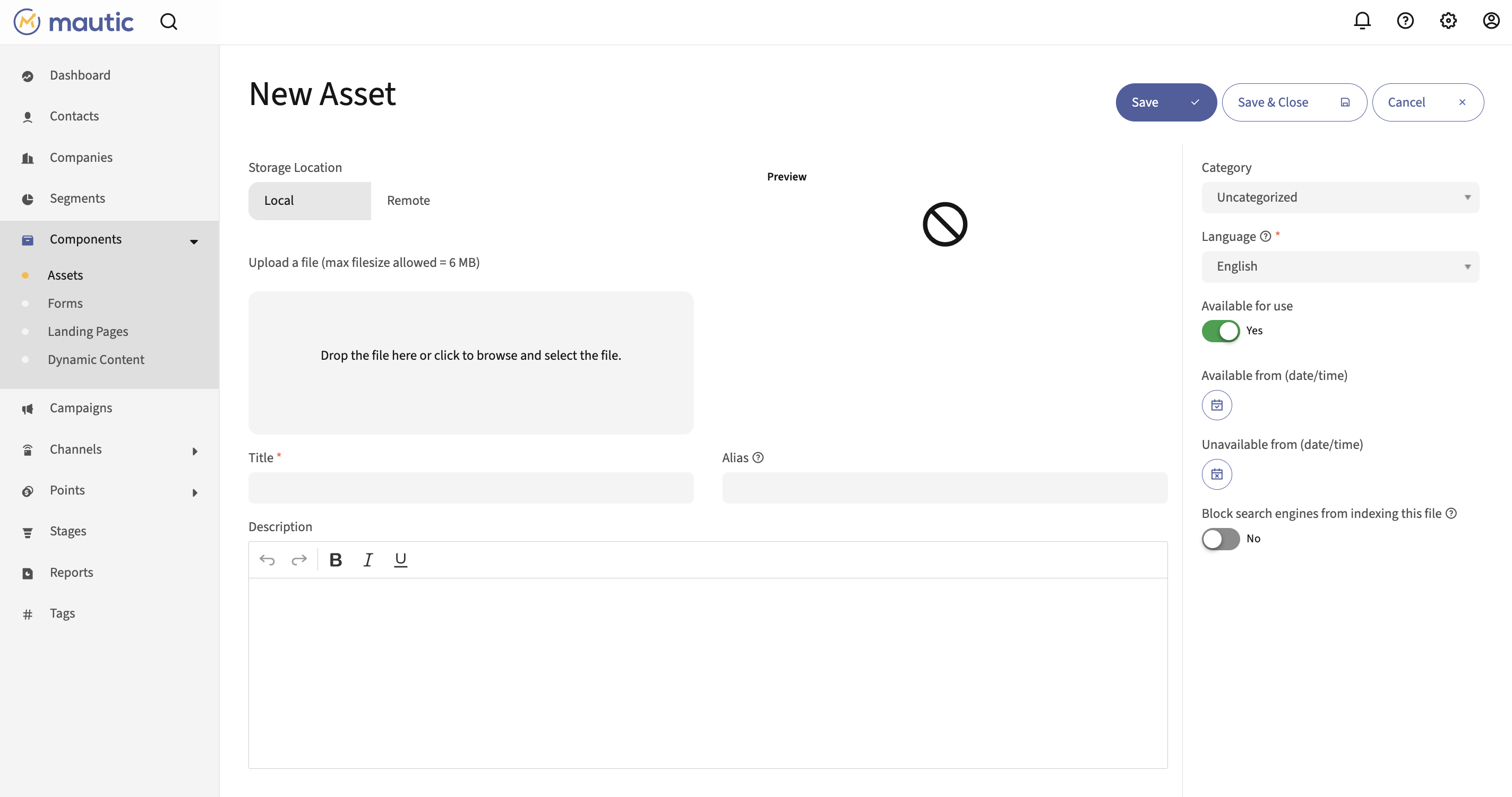 Navigate to Components > Assets. Mautic lists any Assets you have previously created. Click New to begin creating an Asset.