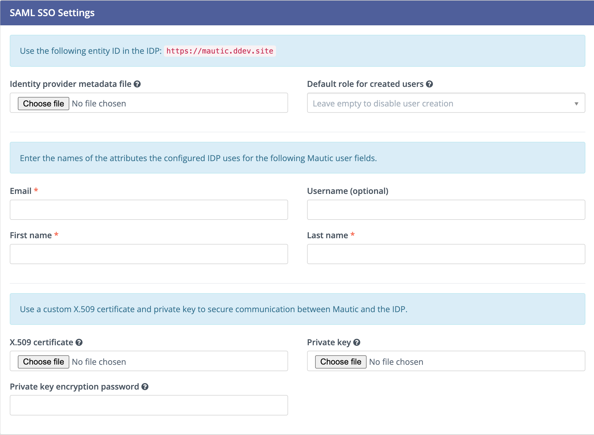 Use a custom X.509 certificate and private key to secure communication between Mautic and the IDP.
