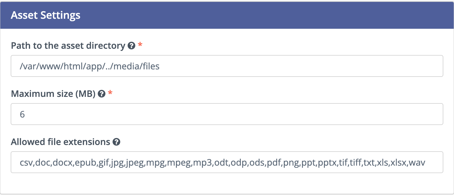 Path to the Asset directory - Set the absolute path to the Assets upload folder. In order to prevent the public from accessing Assets, use a directory outside of the public web root.