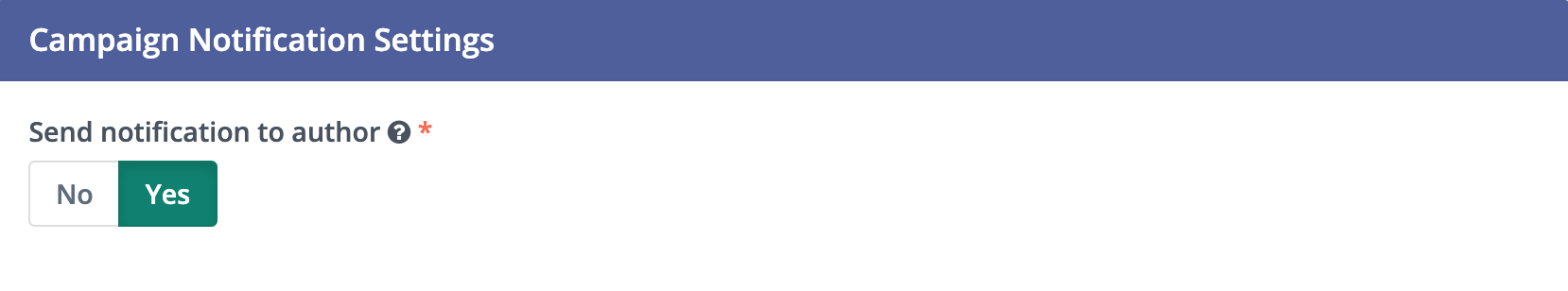 Send notification to author - Set this field to Yes to send an Email notification to the User who created the deactivated Campaign or Webhook. Deleted Users don’t receive notifications.