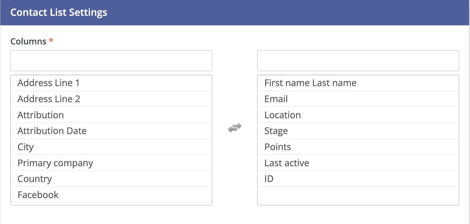 Columns - Select from the left which fields appear on the Contact lists (when you go to Contacts in the Mautic and view the list).