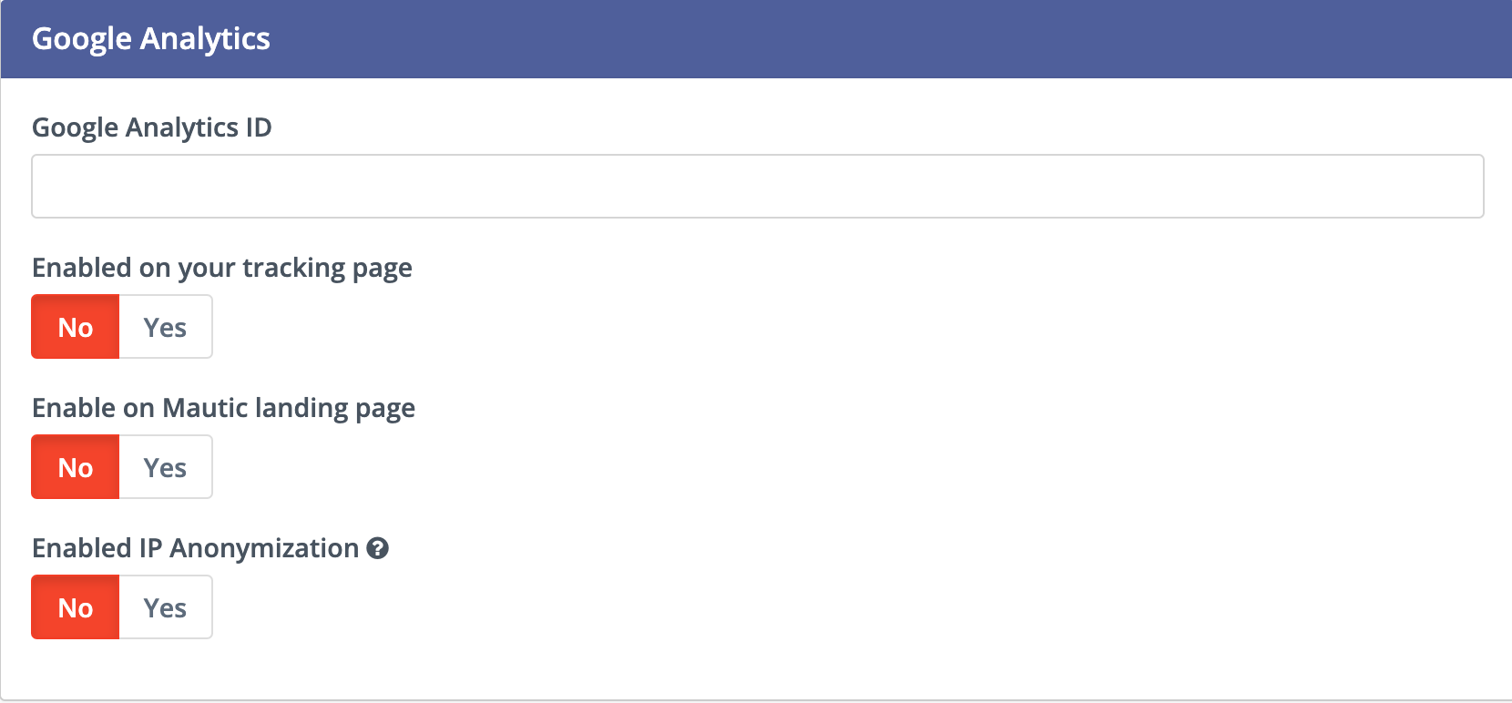 Enabled on your tracking Landing Page - Select Yes to have Mautic append the Google Analytics script to the Mautic tracking code to track Landing Pages where the tracking code exists.