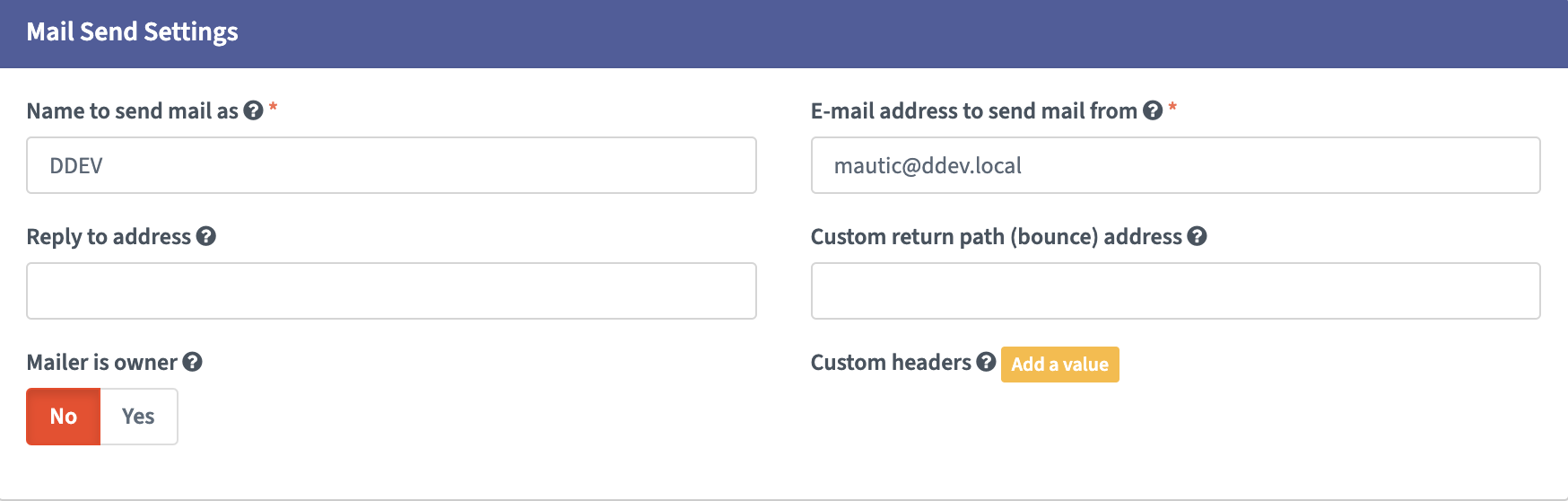 The SMTP transport is the default transport used for sending Emails with Mautic. It’s configured in the Mautic configuration under the Email Settings tab. The configuration is the same as in the Symfony Mailer documentation.