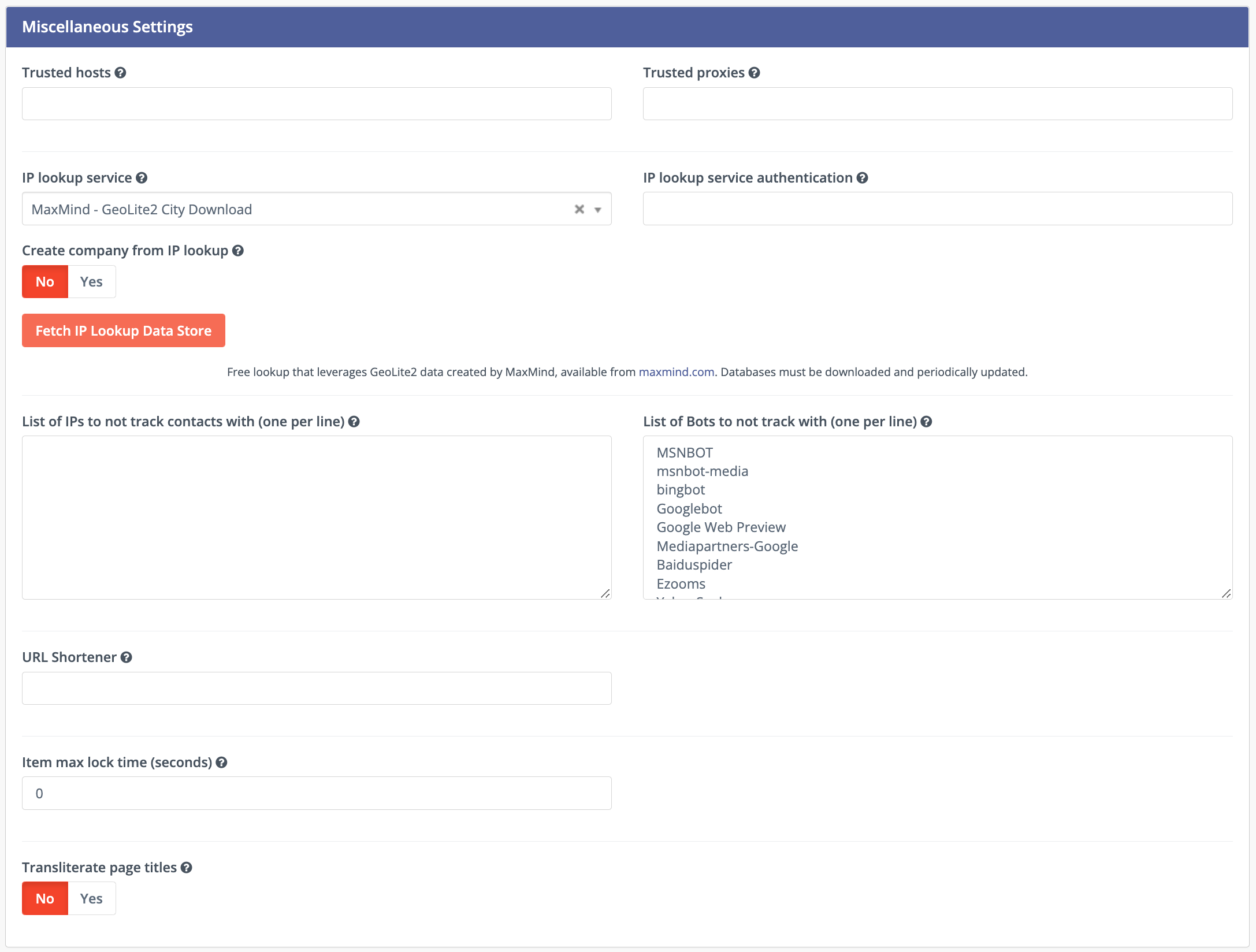Identify visitors by IP - Select Yes to use the IP address to identify Contacts. It’s possible to track unidentified visitors with the same IP address as an existing Contact. This may result in undesirable outcomes with large Companies who use the same externally facing IP address.