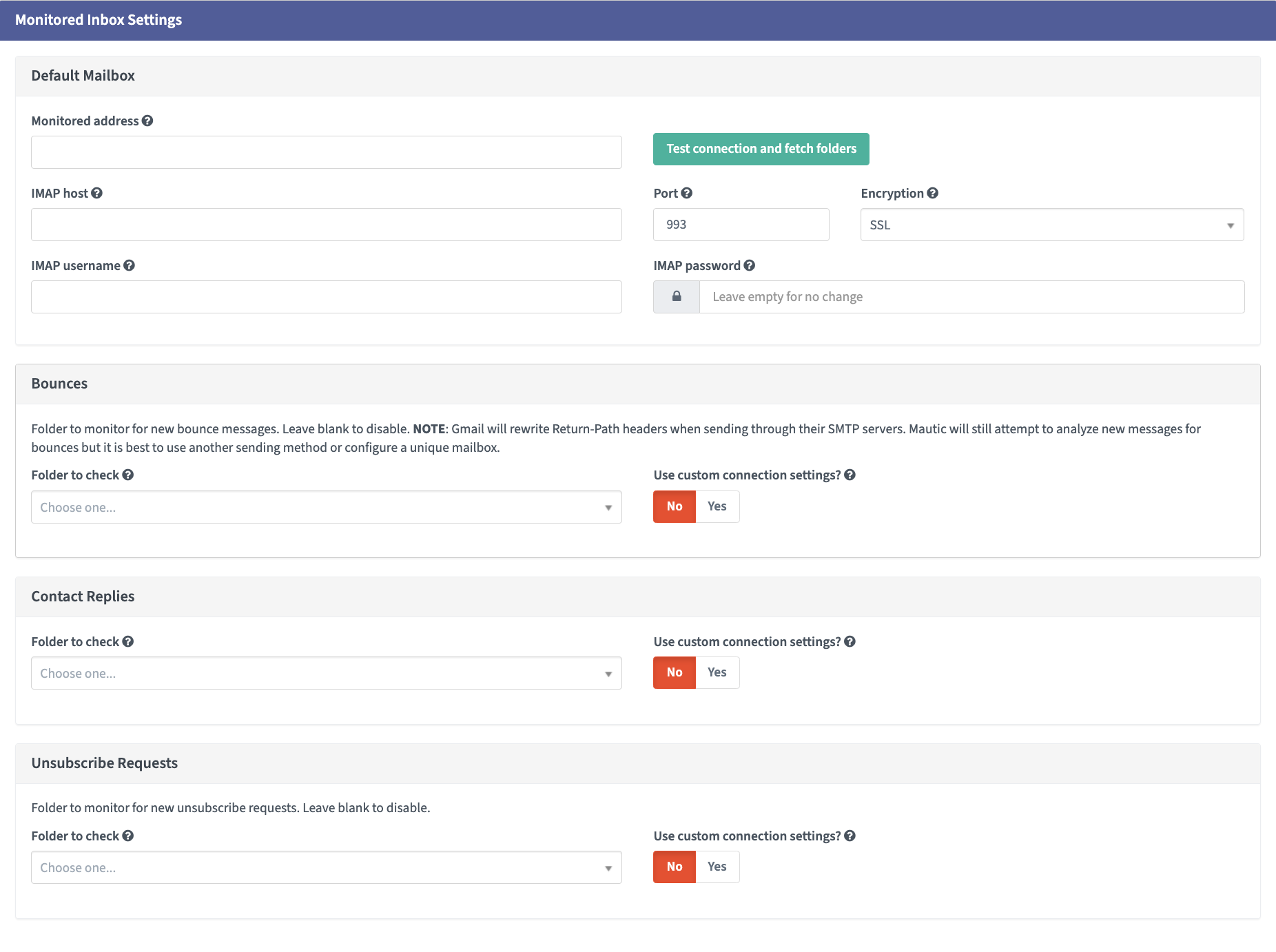 10 minutesas the default.Date Range Filter Default - Sets the default for how far back from the current date Mautic looks for data in Reports including Campaign and Email snapshots charts on the item page. This setting allows you to control the default for how far back from the current date Mautic looks for data. If you’ve changed the setting on a Report, Mautic uses what you’ve entered. Mautic’s default value is