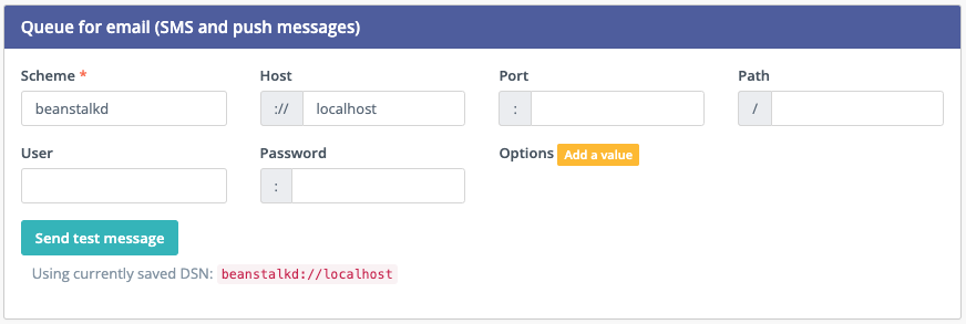 The AMQP transport requires the AMQP PHP extension and a running AMQP service like RabbitMQ. See the screenshot below for an example of the configuration.