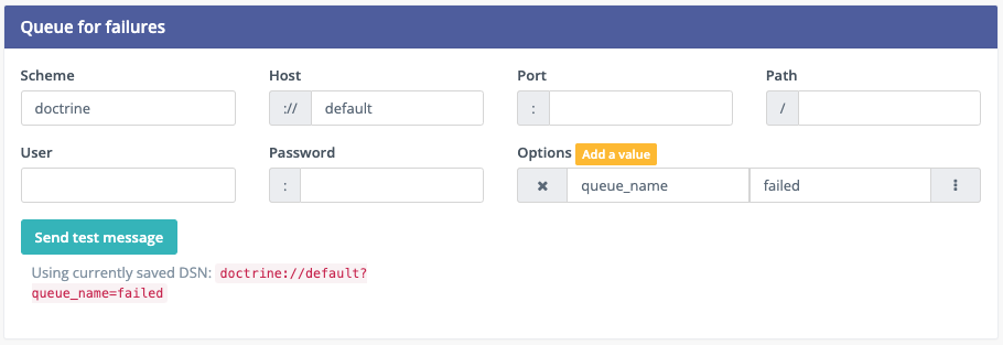 The screenshot below shows the example of configuring the failure queue using the Doctrine transport.