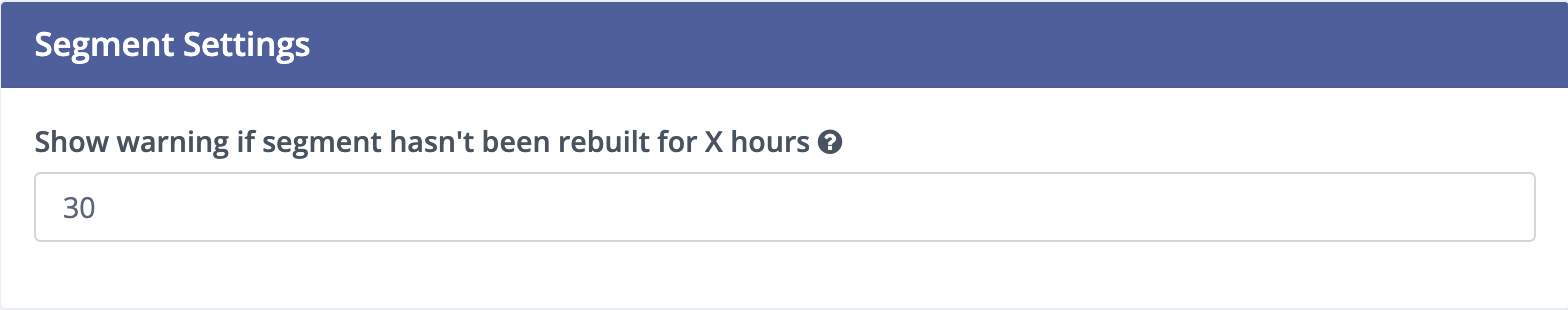 Show warning if Segment hasn’t been rebuilt for X hours - Every time a cron jobs runs, Segments are rebuilt. If there is an error that prevents a Segment from rebuilding, Mautic displays a warning message. This field allows you to configure the allowable length of time between rebuilds, after which the warning message appears.