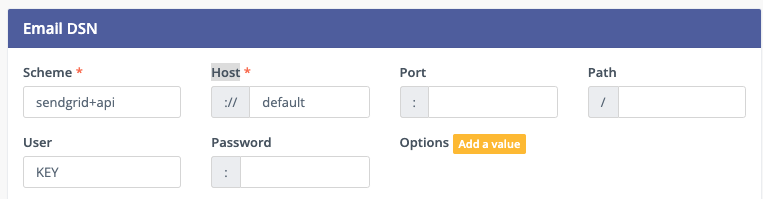 After that, you can configure the transport in the Mautic configuration. The example DSN is again mentioned in the Symfony Mailer documentation along with other transports. In the example of using the SendGrid API, the DSN looks like this: