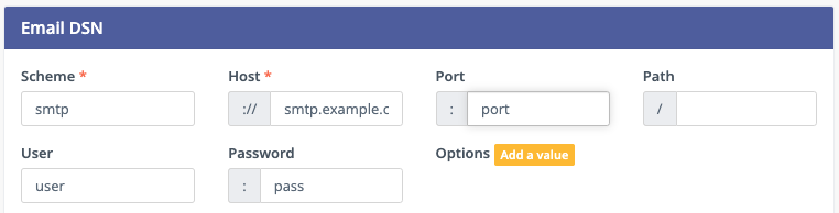 Defines which transport Plugin handles the Email sending. It also defines which other DSN parts must be present. |