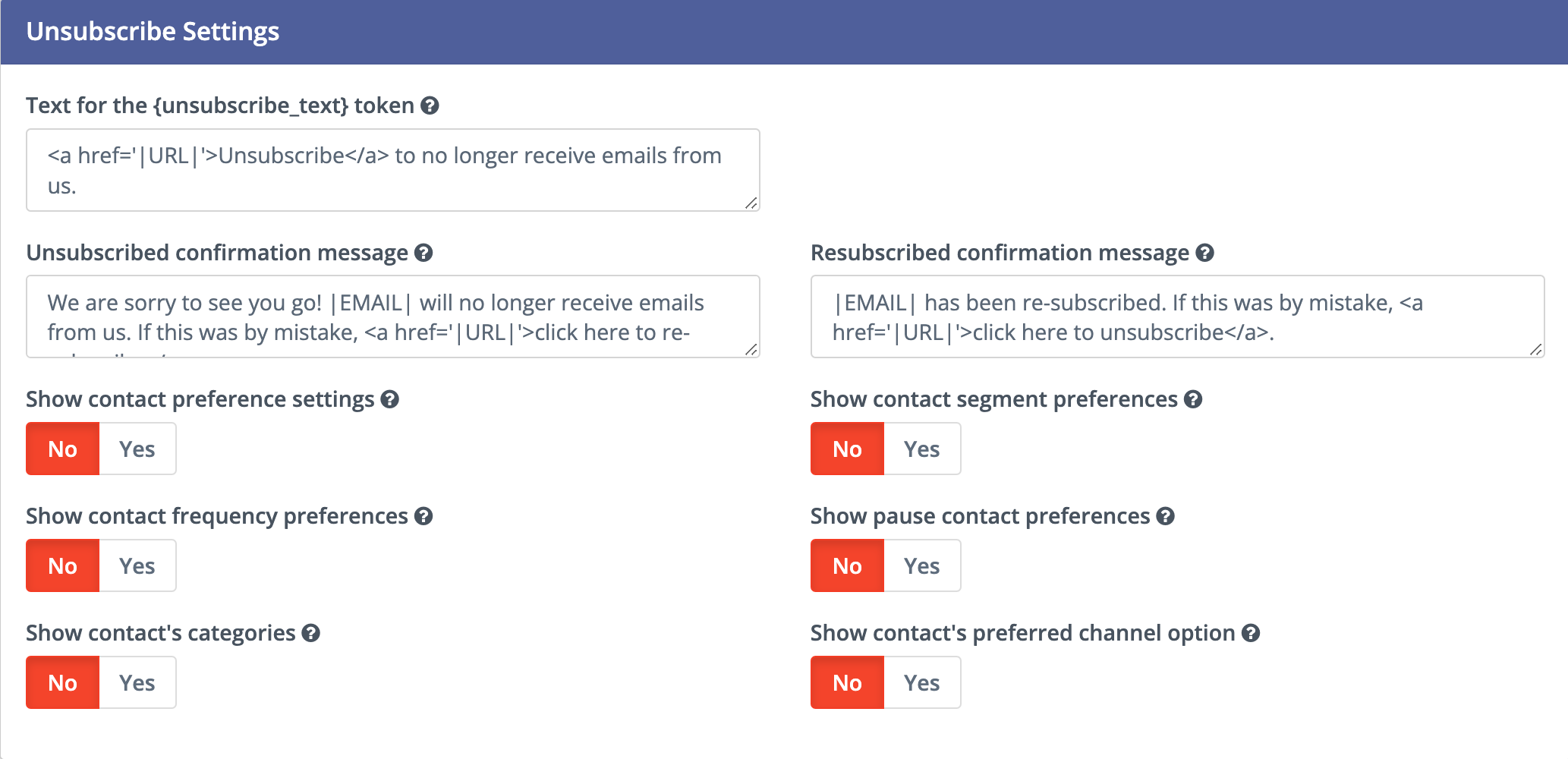 Default item limit per page - The number of Contacts, Campaigns, Emails, etc. which display on each page when you go to an item section. The default is