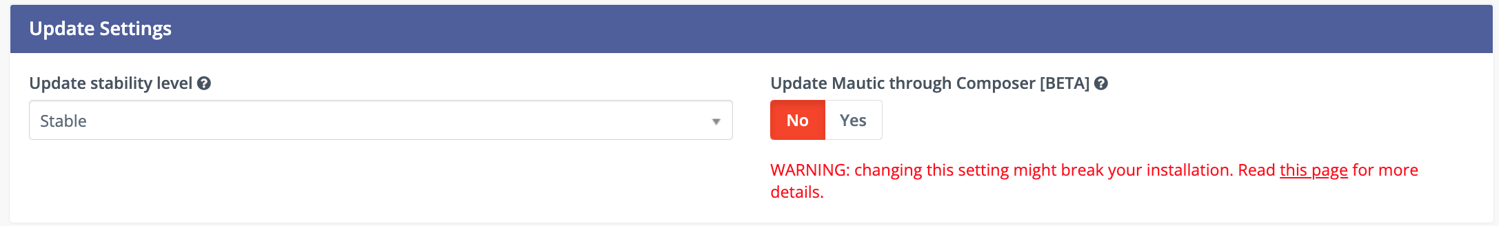 Update Mautic through Composer [beta] - Set to ‘Yes’ if you update Mautic through Composer. This is a prerequisite if you want to install and update Plugins through the Marketplace. This becomes the default installation and update method in Mautic 5.