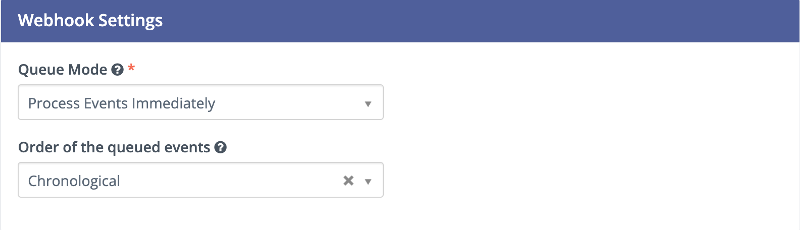 Queue Mode - Select how to process Webhook events. The process immediately executes the Webhook event as soon as it arrives. The queue mode improves performance by only adding the event to the queue and requires processing by a cron command.