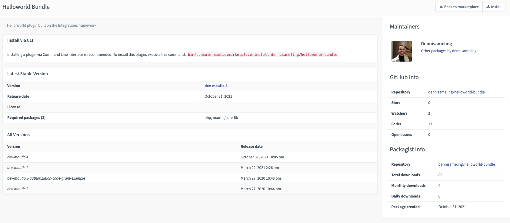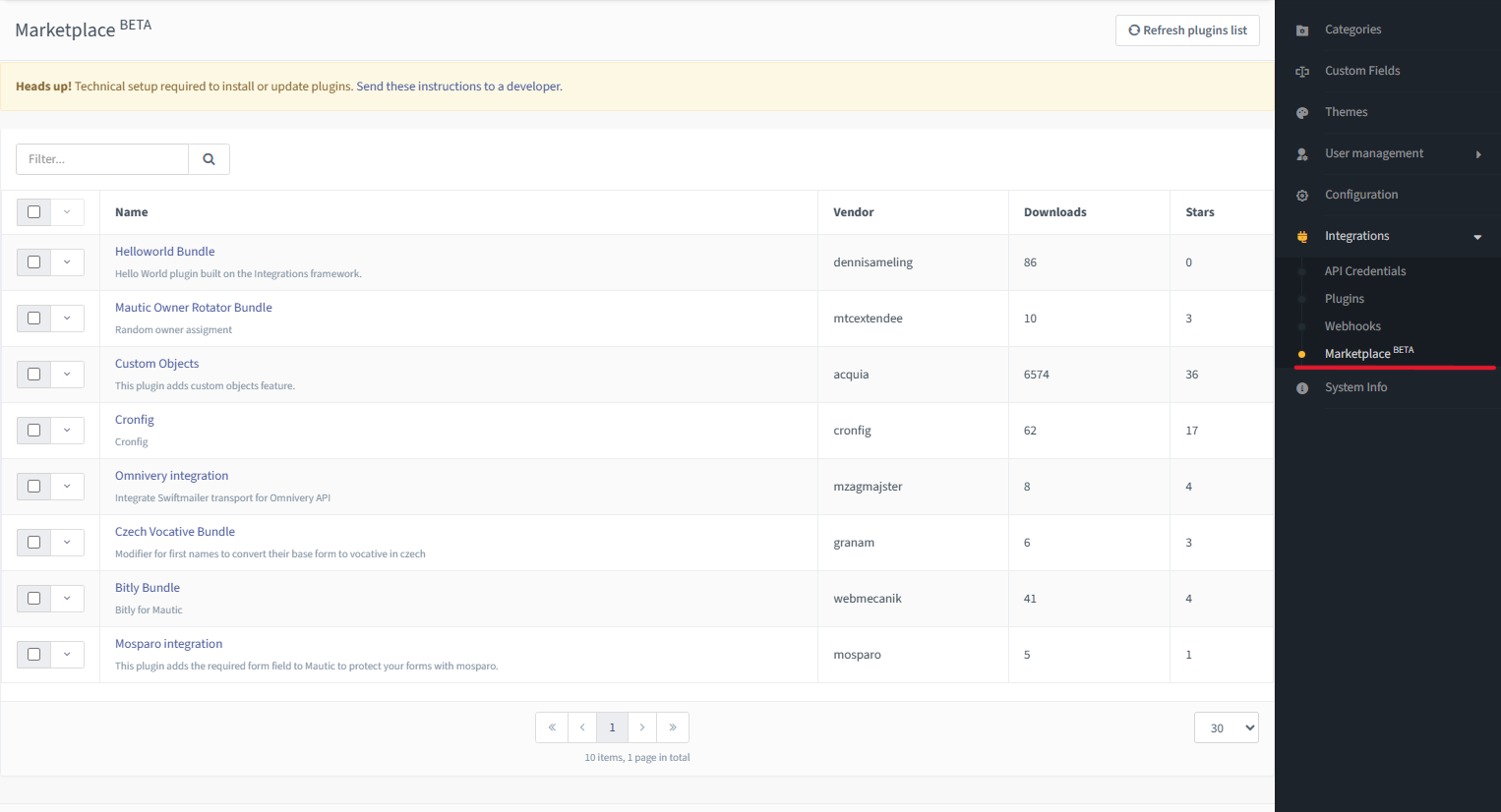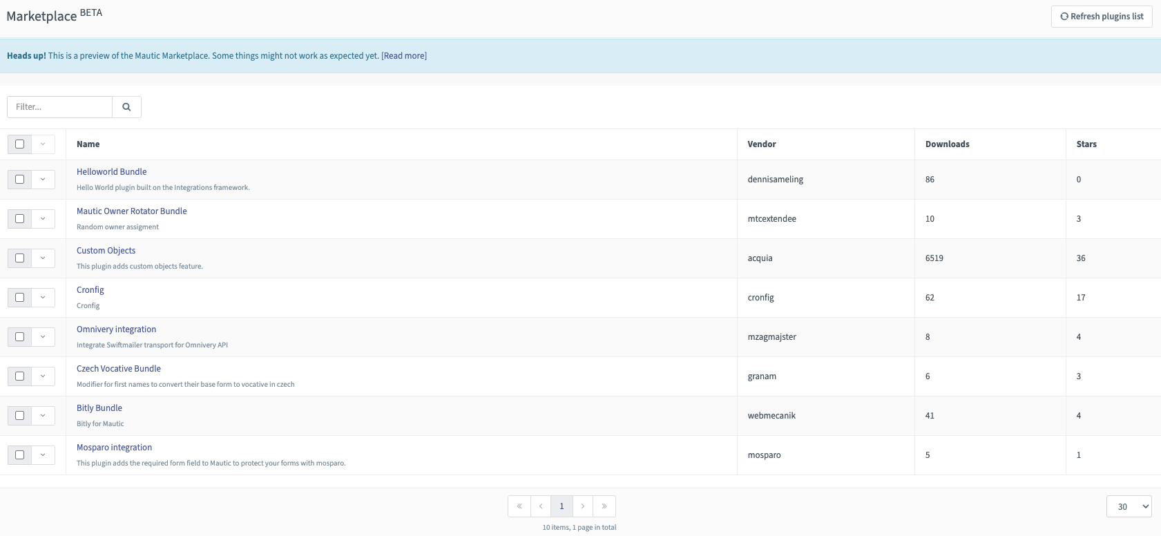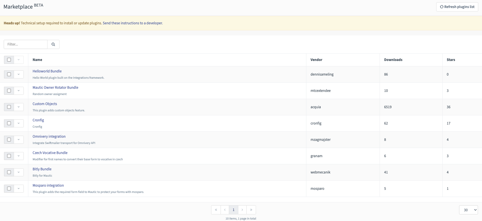 Please don’t blindly manually install Plugins you see in the Mautic Marketplace, as they may not work with your version of Mautic. Always verify if they support your Mautic version before installing. Developers can refer to the Marketplace section in the Developer Documentation for how to make your Plugin compatible with the Mautic Marketplace.