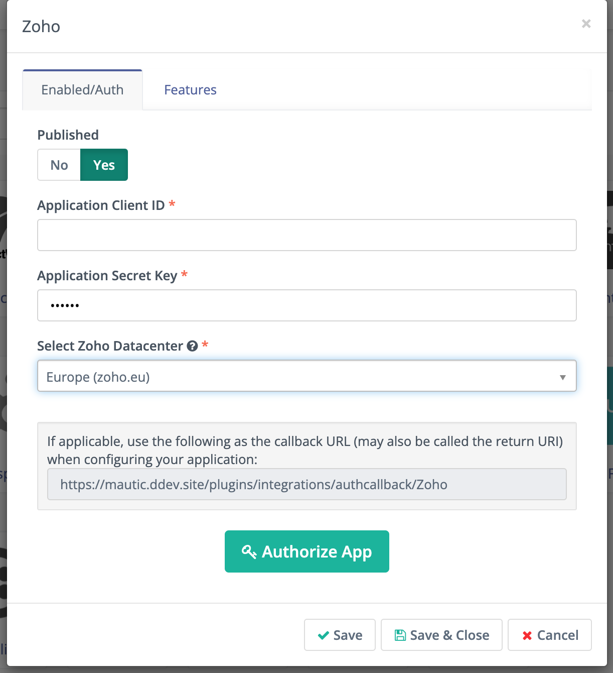 Enter the Client ID and Client Secret you created the Zoho API Console into the Mautic Zoho Integration Plugin.